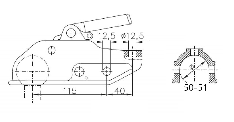 AL-KO:n (Winterhoff) laadukas valurautakuulakytkin 3000kg sydänkahvalla, 50-51mm pyöreälle putkelle, työntöjarruihin.